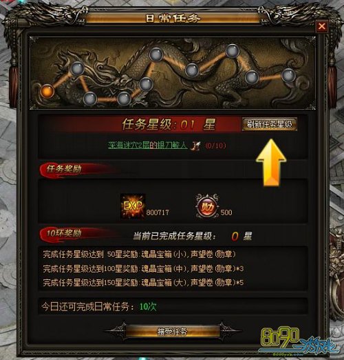 开始任务前点击面板上的刷新任务星级可花费20000金币对刷新任务星级,星级越高则奖励越多,最高为20星。