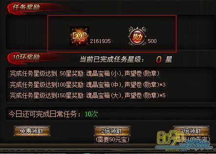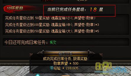 每完成一环任务将获得对应的经验和翅膀经验奖励,并且任务的星级将被累计在10环奖励当前已完成任务星级进行统计,最终完成10次日常根据星级不同可获得不同的魂晶。