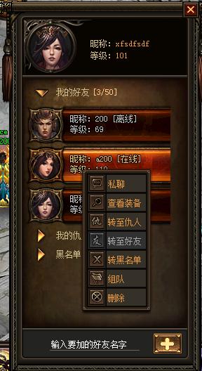 1、好 友列表中有3类分类菜单,“我的好友”、“我的仇人”以及“黑名单”。添加的好友会出现在“我的好友”列,击杀我的玩家会显示在“我的仇人”列,“黑名 单”中存放的是被屏蔽聊天信息的玩家。“我的好友”、“我的仇人”以及“黑名单”3个分类中的玩家可以互相移动到其他分类。当“我的好友”中的玩家击杀我 后,会被自动移动到“我的仇人”列中。