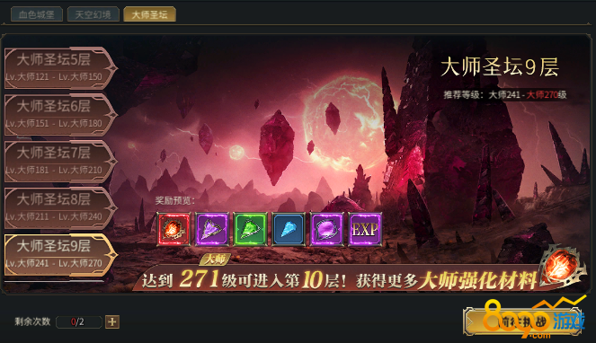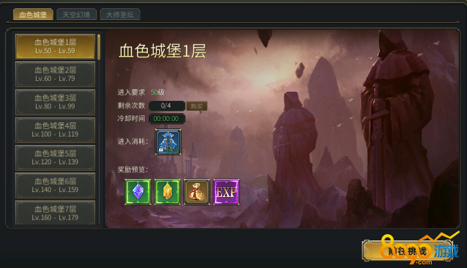 在8090暗夜奇迹中,副本分为血色城堡、天空幻境和大师圣坛三种,达到要求等级就可以进入副本。