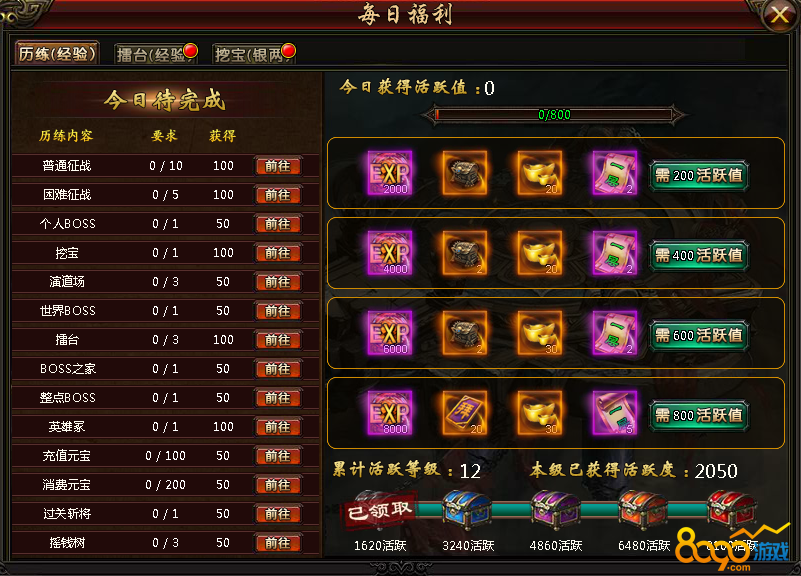 搜索"8090网页游戏"霸将三国每日福利是玩家完成每日任务,然后获得活跃值,活跃值达到一定档位可以领取相应的奖励,里面最吸引玩家的就是经验奖励了。