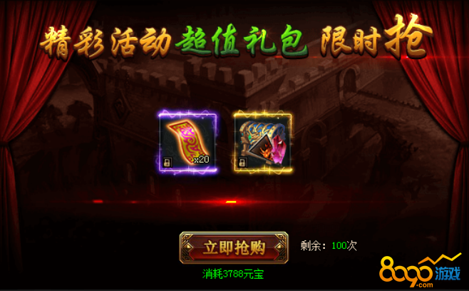 活动期间,购买限购礼包赢取幸运大奖,奖励极品限时称号。(全服限量买到即赚到)购买礼包越多,中奖几率越大!