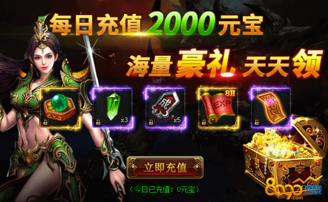 活动期间内,每天充值2000元宝可以领取1000W经验,暗器结晶,成就令牌,探宝符、8小时三倍经验符等海量道具!