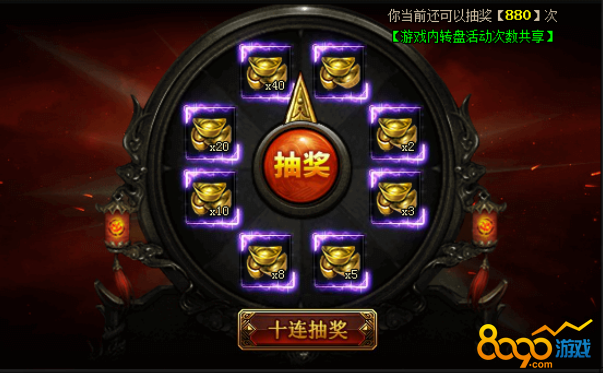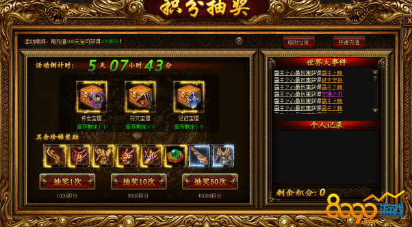 活动期间,开放积分抽奖活动,活动期间充值即可获得积分,可以使用积分进行抽奖,获得大量极品装备和珍稀道具!更有机会获得传世神装、9转符文等超稀有道具!数量有限,先到先得喔!