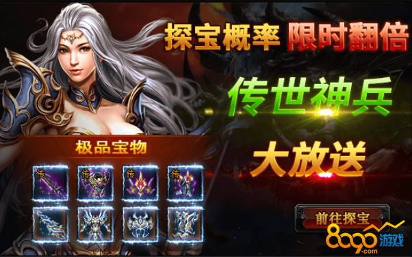 活动期间内,探宝概率翻倍;并有较大概率获得传世神兵、高转装备、霸王神装、等极品道具!