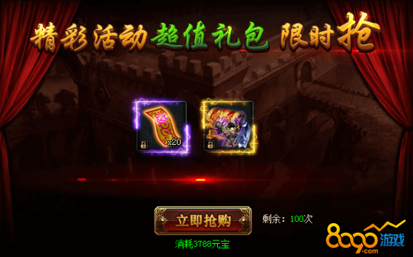 活动期间,可购买超优折扣每日限购礼包,英雄转职卡、印记灵魄、探宝符、羽毛、魂玉结晶、护盾结晶、暗器结晶、成就令牌、声望令牌等极品道具仅限活动期间跳楼优惠!