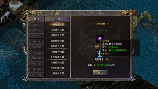 初始合成:使用10个归元丹作为材料,消耗50000绑定元宝,即可合成一个一品神华元婴。