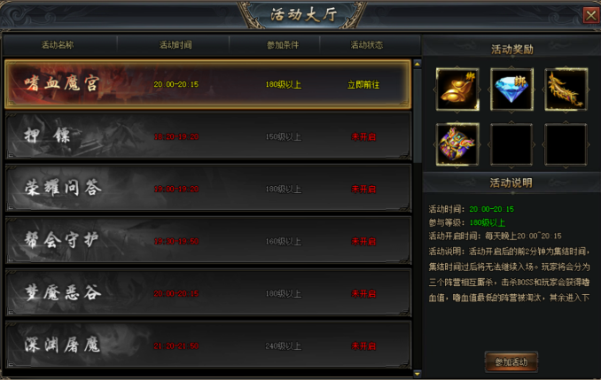玩家达到180级以上,每天21:20-22:00,在热砂荒漠找到嗜血魔宫NPC进入活动,也可以点击右上角活动大厅图标 进入活动大厅界面。查看开启时间。
