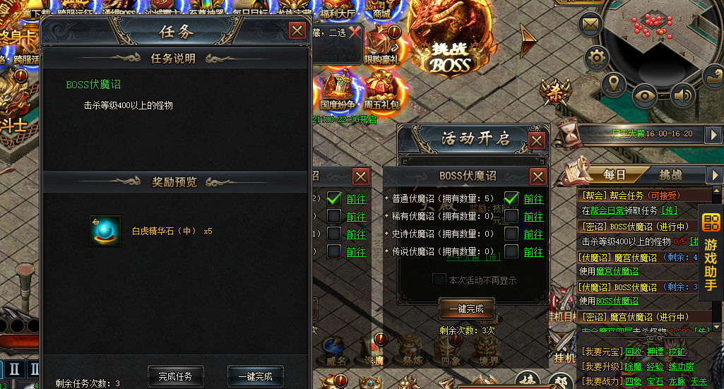 首先点开游戏右边菜单栏中的每日/挑战,找到伏魔诏任务,伏魔诏任务又分魔宫伏魔诏任务和BOSS伏魔诏任务,点击使用魔宫伏魔诏就会弹出魔宫伏魔诏的列表,分别有,普通伏魔诏,稀有伏魔诏,史诗伏魔诏和传说伏魔诏。每一档的奖励都是经验,但是难度越高经验翻倍。点击BOSS伏魔诏同样有4个档次,所获得奖励是不同数量的四象精华之石。任务目标就是再指定场景击杀足够数量指定怪物。点击传送就会自动传送到目标地图上,然后就可以自动挂机击杀任务怪了。达到任务的规定个数就可以点提交任务并获得丰富的个人奖励。