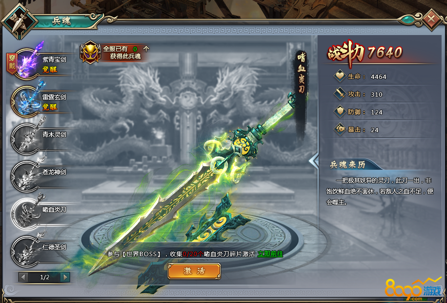 n 激活兵魂可获得兵魂加成属性,与是否穿戴该兵魂无关