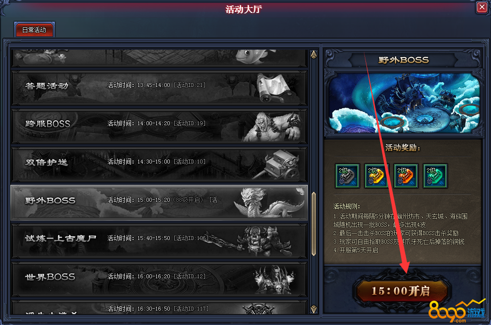 活动时间:进入方式:在活动时间打开【活动大厅】中的【日常活动】页签,点击界面右侧【参加活动】按钮即可自动送入活动。
