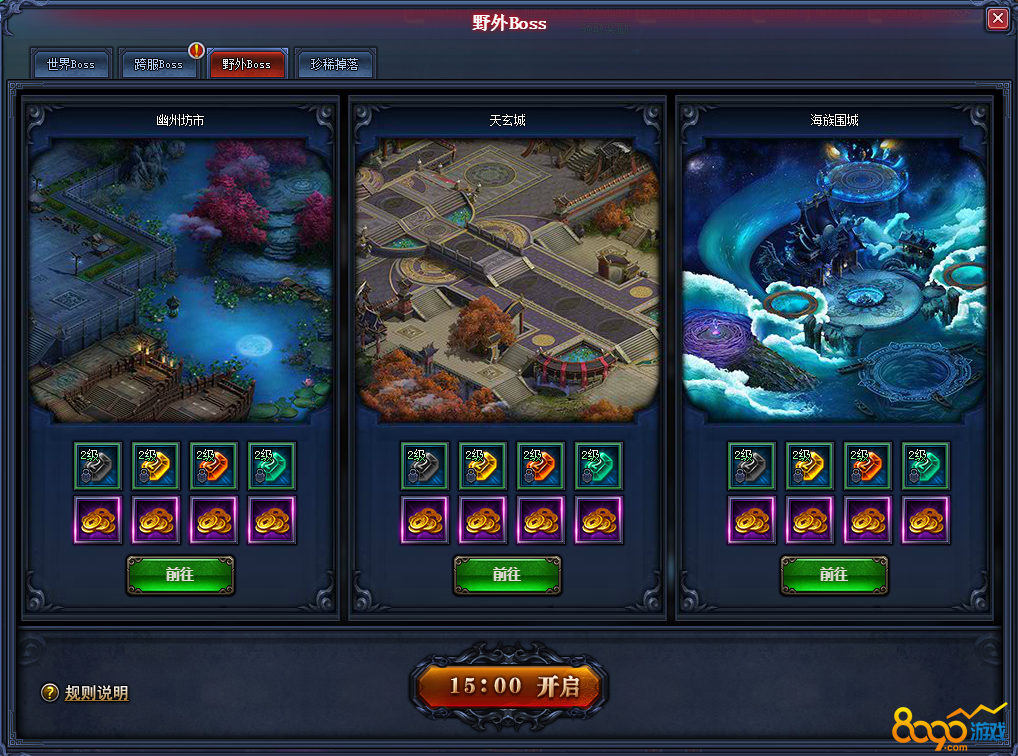 1. 活动期间每隔5分钟在幽州坊市、天玄城、海族围城随机出现一批boss,最多出现4波。