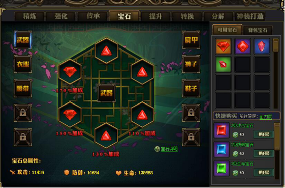 宝石的部位可以通过通关血刀冢来开启,宝石也可以通过血刀冢中获得,宝石等级越高增加的属性越多,有一点比较方便的就是更换装备不影响宝石的属性,所以不需要拆卸下来重新镶嵌,宝石的提升需要花少量铜钱,消耗低等级宝石提升已经镶嵌宝石的等级。宝石也可以直接通过商城购买,当然那样的价格是很贵的。