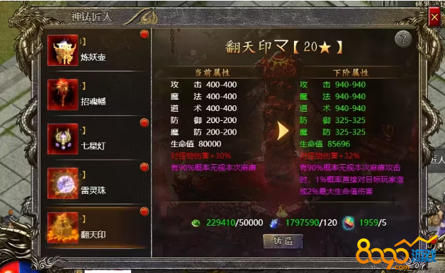 翻天印的升级不受限于玩家的经济条件,因为这些材料通常可以通过击杀野外怪物获得,因此即便是普通玩家也可以努力升级至满级。当翻天印升至20级后,需要前往行会领地的“神铸匠人”NPC处继续升级,这次升级需要消耗更多的无量晶、命运石和女娲石等特殊材料。目前,翻天印最高可升至25级。