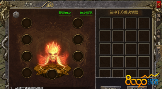 领悟兽决:可以消耗兽决进行领悟,最多可领悟九本兽决。领悟成功后,有概率开启新的兽决格或替换已领悟的兽决之一。