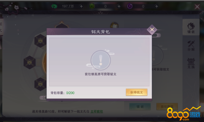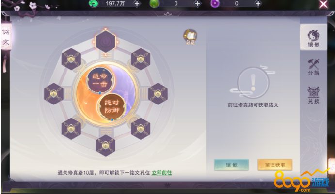 铭文镶嵌:每个阵眼有3个铭文,每个孔位都可以选择指定类型的铭文进行镶嵌。同类的铭文在整个八卦阵中只能镶嵌3个。