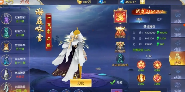 特定披风和战骑:谢庭咏雪、画龙点睛和灼灼桃花披风分别可以增加3.6%的吸血属性。天涯月饼和步步莲花战骑同样也能增加3.6%的吸血属性。谢庭咏雪披风可以通过世界拍卖获得,每天限定两个碎片。画龙点睛、灼灼桃花、天涯月饼和步步莲花则需要通过消费兑换,每个道具的兑换时间都有所不同,玩家需要密切关注。