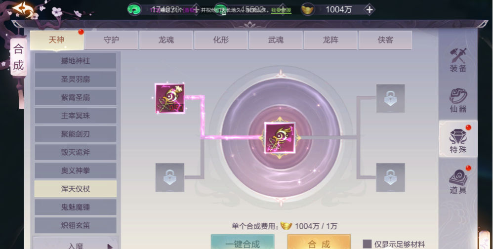 首先,让我们聚焦于天神武器。在游戏前期,玩家可以通过收集碎片的方式来合成天神武器。其中,九霄羲和作为前期非常关键的一位天神,其入魔状态和武器都尤为重要。这些珍贵的物品通常会在每天晚上的拍卖活动中出现,因此,想要获得九霄羲和的入魔武器,就需要密切关注拍卖活动,并准备好足够的竞拍资金。