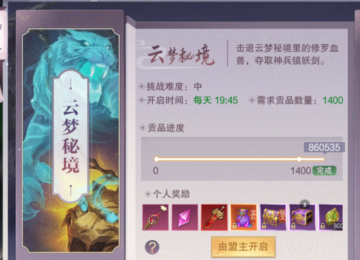 云梦秘境,一个充满挑战与机遇的神秘空间,每晚19:45至23:00准时开启,等待着仙盟成员们的探索。不过,想要进入这个秘境,可不是那么简单哦。首先,需要仙盟成员们齐心协力,通过投票来决定是否开启此次探险之旅。此外,还需消耗一定的“贡品”作为进入秘境的凭证,这些贡品可以通过每周的仙盟任务获得。