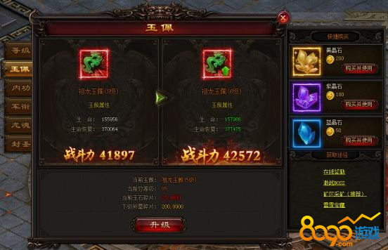 获得:在线奖励、击杀怪物、矿区采矿、雷霆宝藏得到玉石碎片进行升级。