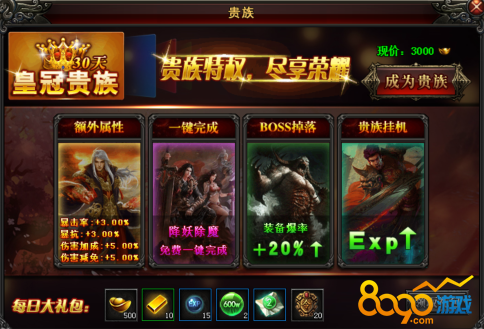 在这里,只要3000元宝,玩家就可以获得:额外属性、一键完成、boss掉落、贵族挂机4种福利,另外每日还可以领取一个豪华大礼包,3000元宝只要30元,买不了吃亏,买不了上当。