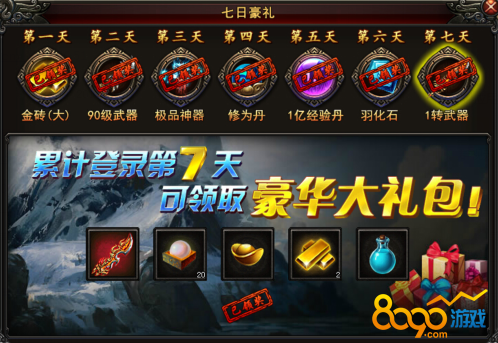 七日豪礼活动,每天登陆都会有不同的奖励可以领取,而且每天的奖励都会有一个重量级的道具,比如第二天送90级武器,第三天送极品神器,第七天更是送1转的武器,中途还有各种道具材料奖励,领到手软哦!