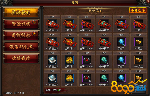 福利大厅,这里也都是玩家免费领取的奖励,第一个就是签到奖励,玩家只要登录游戏就可以签到领取道具,资源找回,可以找回大量的经验和金币,元宝找回获得更多哦,让你等级升不停,离线经验当然就是玩家下线之后到下次登录,中间的经验玩家可以上线后直接领取哦,同样元宝领取获得更多经验,另外就是还有激活码,玩家可以找客服大大咨询礼包的获取哦(我不会告诉你们礼包码有很多的,加2850968055),最后一个就是你提我改,这游戏游戏比较人性化的一点,如果玩家对游戏有任何意见或者想法,或者是问题,都可以从这里提交给游戏官方进行处理哦。