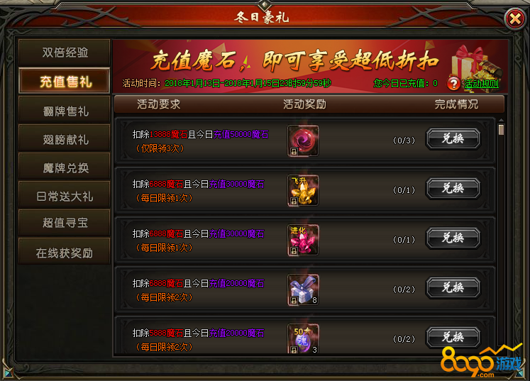 活动说明:活动期间,充值一定数额魔石且消耗少量魔石可领取活动奖励