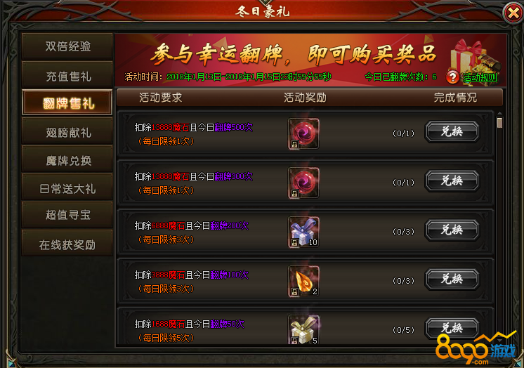 活动说明:活动期间,参与幸运翻牌活动,翻牌一定次数且消耗少量魔石可领取活动奖励