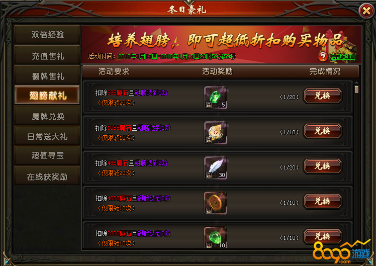 活动说明:活动期间,翅膀到指定阶数且消耗少量魔石可领取活动奖励,阶数越高,奖励越丰厚!