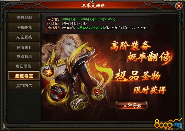 2、开服时间>=15天活动期间,众神宝藏大放送,高阶装备抽取概率翻倍,更有极品神器来袭,限时4天,切勿错过!