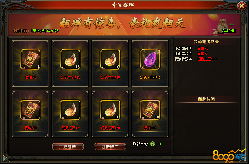 5、 每轮翻牌结束,每隔30分钟自动刷新牌库,亦可花费魔石立即刷新