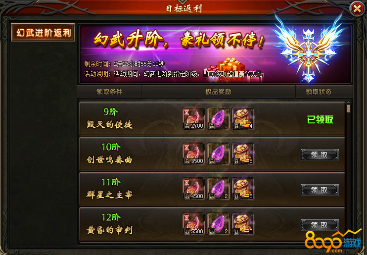活动说明:活动期间,幻武进阶到指定阶级,可领取超值豪华大礼;