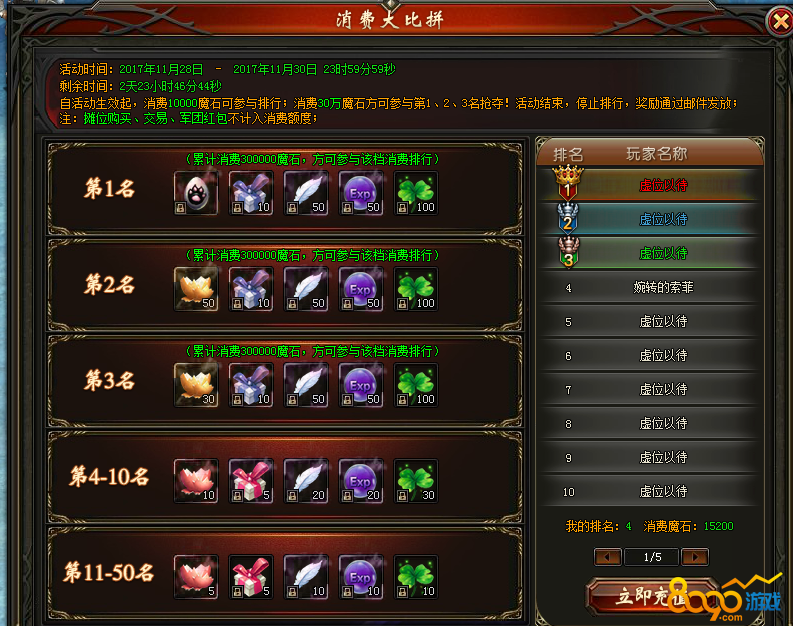 活动说明:自活动生效起,消费10000魔石可参与排行;消费30万魔石方可参与第1、2、3名抢夺!活动结束,停止排行,奖励通过邮件发放;