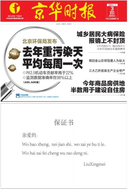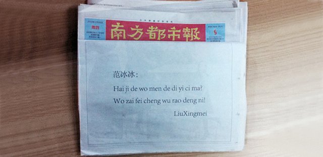刚刚过去的2013年12月26日,也就是影星范冰冰(微信号:fbbstudio916)在新浪开通微博的第二天,在京华时报、南方都市报、齐鲁晚报、重庆时报等全国各地的九大报纸上出现了一则半版神秘拼音体示爱情书,文中除“范冰冰”为汉字外,其余内容全由拼音完成:“范冰冰,Hai ji de wo men de di yi ci ma? Wo zai fei cheng wu rao deng ni! LiuXingmei”
