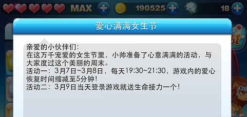 活动一:3月7日-3月8日,每天19:30-21:30,游戏内的爱心恢复时间缩减至5分钟!