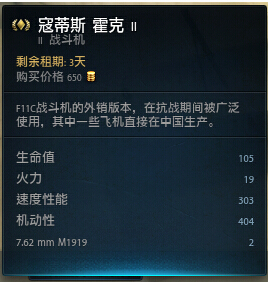 3、购买成功后,玩家可到机库查看购买战机。时限金币飞机的战斗收益比其它同等级的科技树战机收益要高,与永久金币机的收益相同。在有效期内的时限飞机玩家也可以选择延长时限时间,时限时间可无限累计叠加。