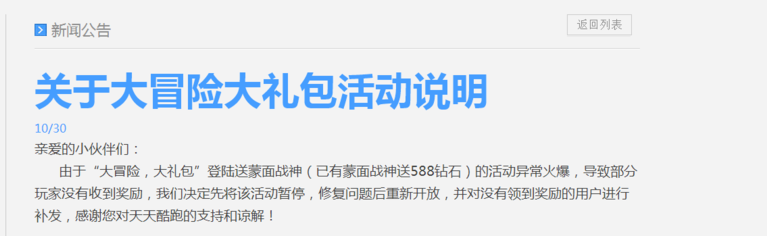 官网说明由于大冒险,大礼包登录送蒙面战神的活动异常火爆,导致部分玩家们没有收到奖励,这可能是系统或者服务器的原因,所以开发准备先将这个活动暂停,等修复问题后重新开放。