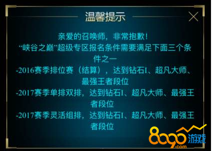 满足以上任意条件,即可登录专题页报名申请超级服入驻资格。如果有些玩家是上赛季钻石1是可以正常报名的哦。