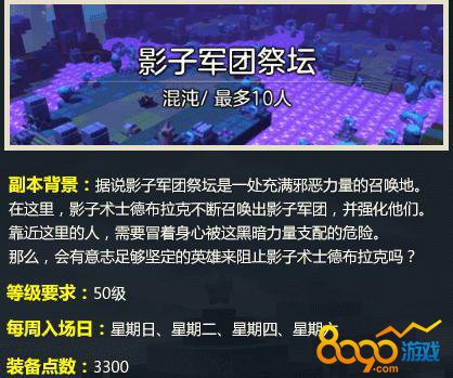 还有新增了几个新副本,其中混沌副本是有影子军团祭坛,还有月光船长要塞副本,都是50级的副本哦,装备点数分别是3300和5000,奖励也是基本上差不多的。