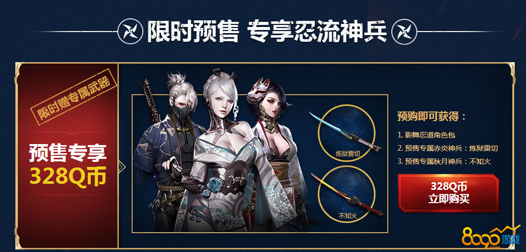 本次的忍流神兵角色包玩家在购买的时候可以获得赤炎,初霜还有秋月这三种角色的。其中赤炎和秋月可以在预售的时候获得炼狱雷切和不知火的武器的。