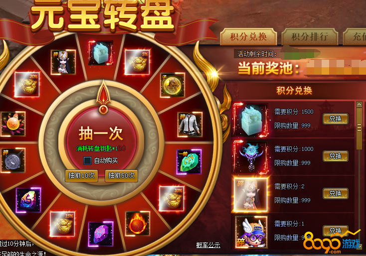 搜索"8090网页游戏"阴阳劫游戏中元宝转盘端午福利活动抽奖,幸运元宝转盘,抽奖一次需要消耗25元宝,可选择抽10次或抽50次。比较好一点的极品装备比如苍龙印、精灵白无常碎片、时装荒野迷彩碎片等。