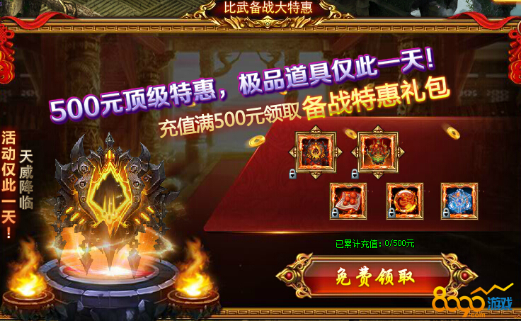参与此活动的同时还能够获得远古圣物道具,远古诸神遗留的圣物,拥有吞天噬日之能,双击使用提升远古装备精炼2000%的加成属性,非常给力!