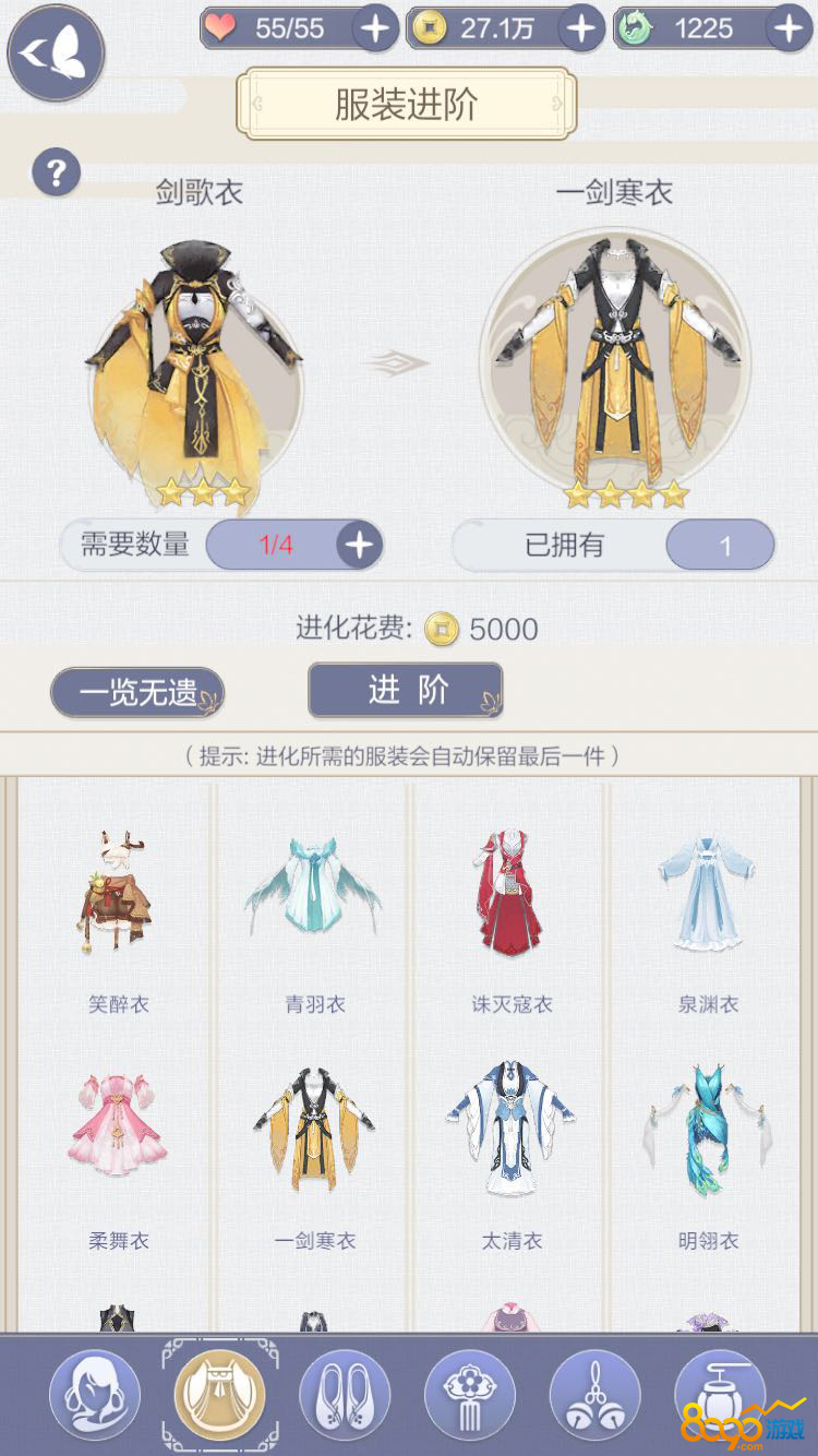 通关普通关卡前三章就可以开启困难关卡了,在困难1-1中,主要集齐的就是剑歌套装。只要集齐剑歌套装就可以完美通关,那么剑歌套装如何获得呢?其实不难,只要体力够,获取方式就非常简单了。只需要集齐一剑寒束、一剑寒衣和一剑寒靴就可以通关,但是达到完美五星那还差的很远哦,还需要去商店购买剑歌袜、剑歌剑。一剑寒束、一剑寒靴就比较难获得了,需要在普通关卡获取基础部件,再通过进阶来合成要求服饰,这对体力的消耗非常大哦。