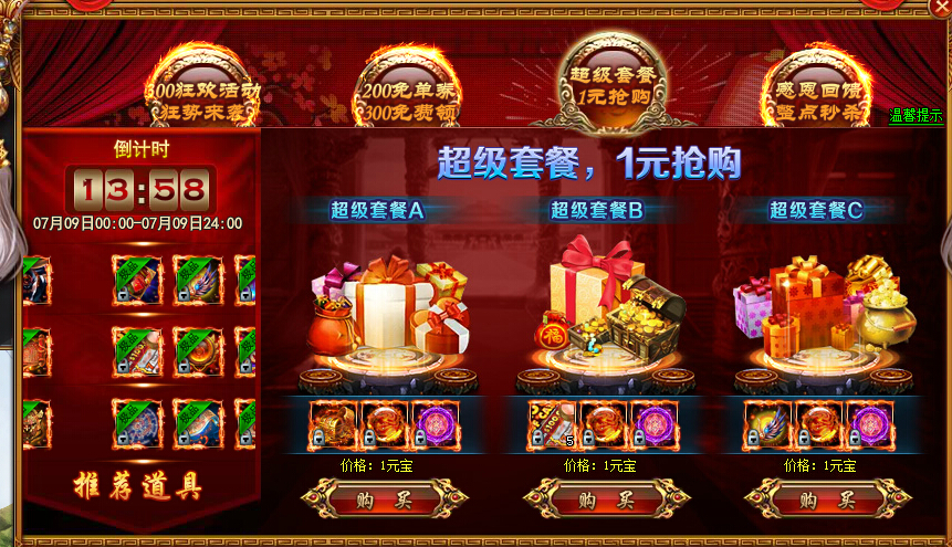 活动期间只需充值充值满300元即可参加超级套餐抢购活动,满足条件后玩家只需花费1元宝即可在相应页面参加活动,活动套餐分为ABC三个套餐,其中小编最推荐大家兑换的是套餐A,套餐A中包含全新的群雄宝藏特权,三国之后,群雄消逝,天书世界中流传着一则传说,传说中群雄的宝藏埋葬于世界的某个角落,等待有缘人挖掘后再次归来,重新角逐这个天下,激活后,能够直接提升武将三百万的战斗力,每天可以任选一座城池进行挖掘,必定获得道具奖励,并且有概率获得传说中的群雄宝藏,每次挖掘群雄宝藏可以获得群雄属性加成,额外提升人物的战斗力,其中藏品包括:陪葬品、天道丹、诸天君王令等极品道具!