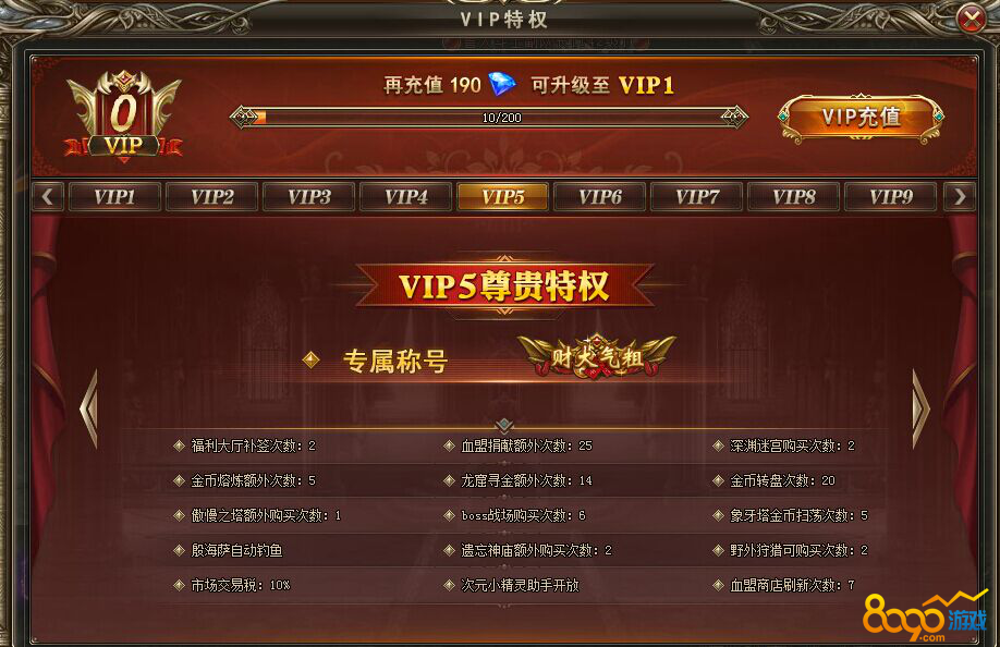 VIP5可以获得专属称号:财大气粗。除此之外还有很多的特权。福利大厅补签次数:2,血盟捐献额外次数:25,深渊迷宫购买次数:2,金币熔炼额外次数:5,龙窟寻金额外次数:14,金币转盘次数:20,傲慢之塔额外购买次数:1,BOSS战场购买次数:6,象牙塔金币扫荡次数:5,殷海萨自动钓鱼,遗忘神庙额外购买次数:2,野外狩猎可购买次数:2,市场交易税:10%,次元小精灵助手开放,血盟商店刷新次数:7.