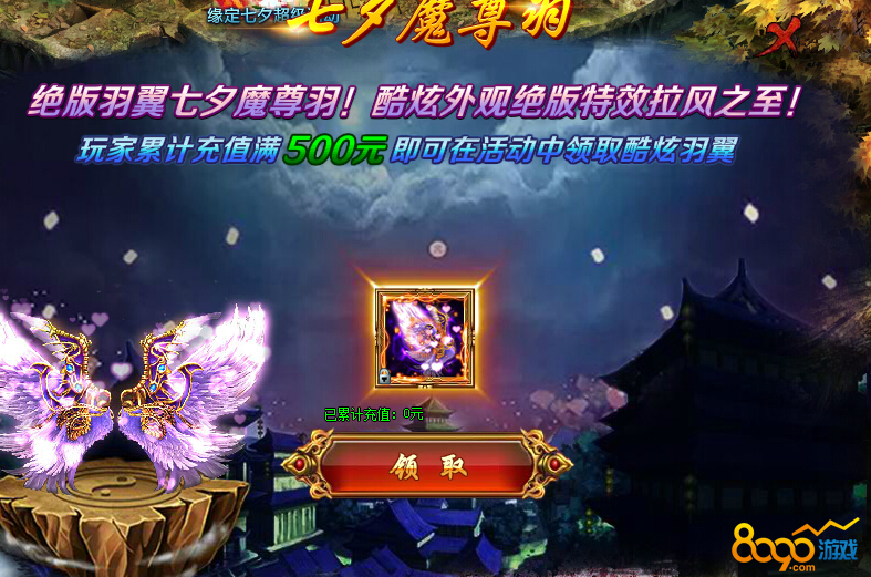 玩家只需在活动期间累计充值满五百元参加七夕活动,其中最为超值的便是可以获得七夕魔尊羽外观。七夕之月,魔尊重生,爱与力量的结合,拥有无与伦比的力量,激活后可以直接为人物带来大量三围属性加成,并且获得五百点身法天赋,不仅如此,还能够获得三大七夕魔尊神技: