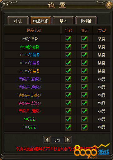 小编给的建议是把白装和绿装都设置不拾取不显示;初级,高级等级丹也设置为不拾取,不显示;而元宝和绑定元宝之类的金币类道具可以设置为不显示,这样整个游戏界面就会变得清楚很多,也不会因为文字太多太乱而让人眼花了。