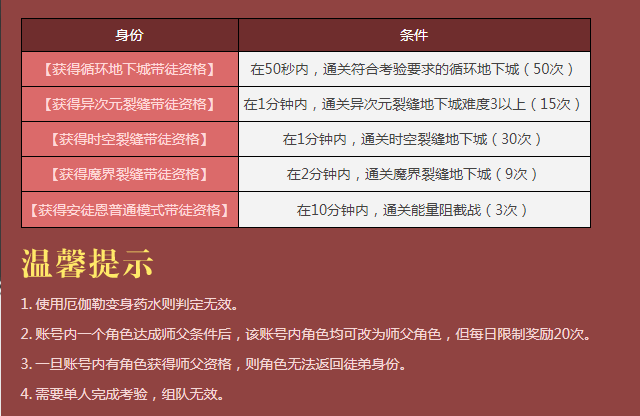 师徒组队活动是从8月16日开始,所有人默认为徒弟状态,然后进行师父的考验获取师父的身份,然后和以前的活动差不多,就是通关地下城,就有对应的奖励如下: