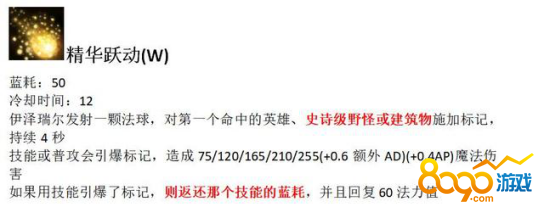 W技能在被技能触发后,还会返还该技能的蓝量,如果能够准确的命中目标,无论是在对线期还是中后期在续航和压制上带来的增幅是不容小觑的。附带的0.6AD+0.4AP加成让EZ完全可以走一个双修流派的打法,众所周知,混伤英雄能给敌方坦克的出装造成不小的压力,在前中期配合W技能完全有可能直接一套WEAQ骑脸直接秒杀脆皮!